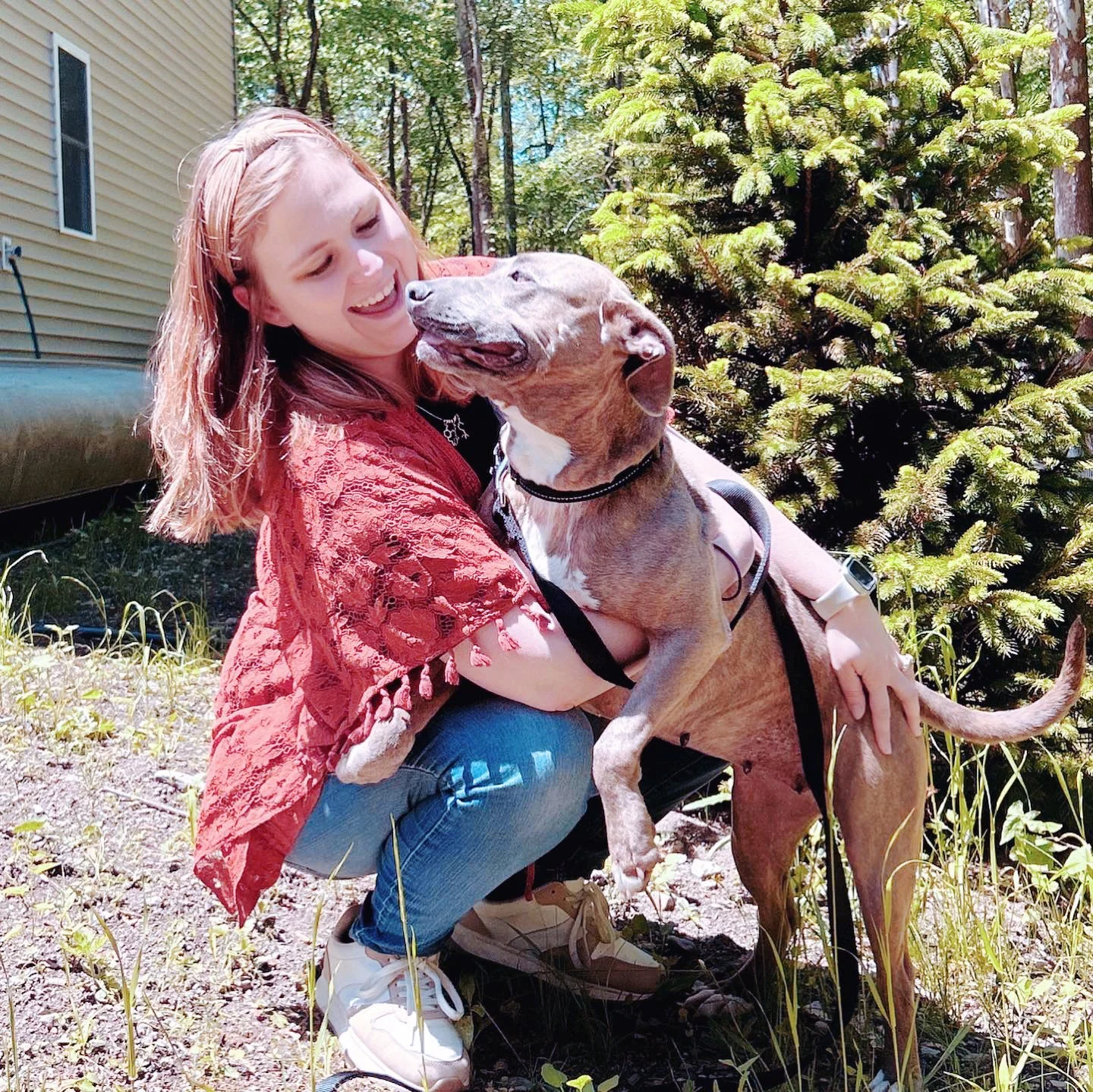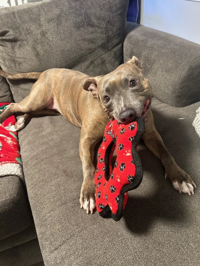 Like many humans, Jojo is also a trauma survivor. In November 2023, she was found chained up in a junk yard in South Carolina, with lasting medical and dental damage. Through lots of love, snuggles, and treats, she has worked through so much anxiety. She is incredibly resilient and brave. She is truly the most gentle and sweetest dog you will ever meet. She really just needed a family to love her, and now she feels safe enough to be her goofy self.